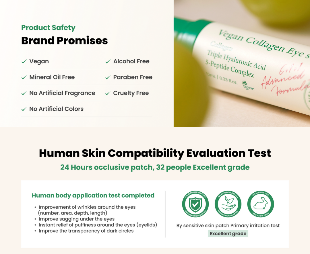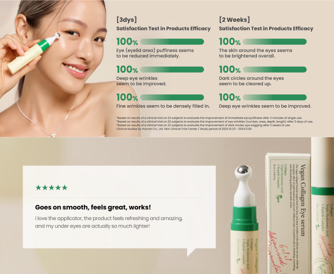 The vegan collagen + niacinamide + peptides brighten the area, improve circulation, and make the under-eye look fresher and more awake every day.